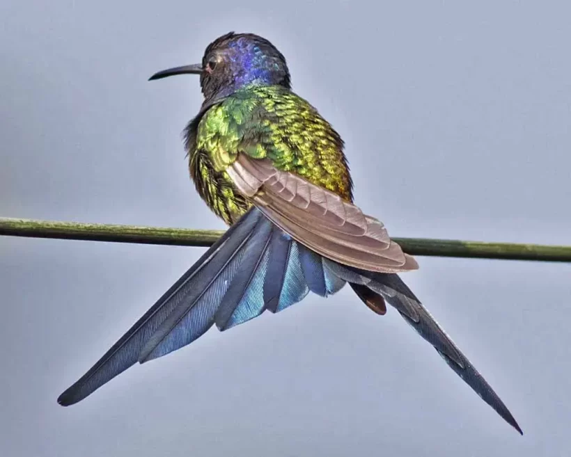 Mede entre 15 e 19 centímetros de comprimento, sendo um dos maiores beija-flores brasileiros, pesando em torno de 9 gramas. Cabeça, pescoço e parte superior do tórax de um profundo azul violeta; restante da plumagem verde-escuro iridescente. Pequena mancha branca atrás dos olhos; rêmiges castanho-escuro; raques das primárias externas alargadas, embora sejam bem menos evidentes que as espécies do gênero Campylopterus; cauda azul-escuro; calções brancos; bico ligeiramente curvado para baixo e preto. Tem como característica principal a cauda longa e profundamente furcada que toma quase 2/3 do seu tamanho total. Esporadicamente apresenta as penas azuladas da fronte tingidas de branco, amarelo ou de cores diversas, em virtude do acúmulo de pólen proveniente das flores que poliniza. A fêmea é quase igual ao macho, sendo um pouco menor e mais pálida.